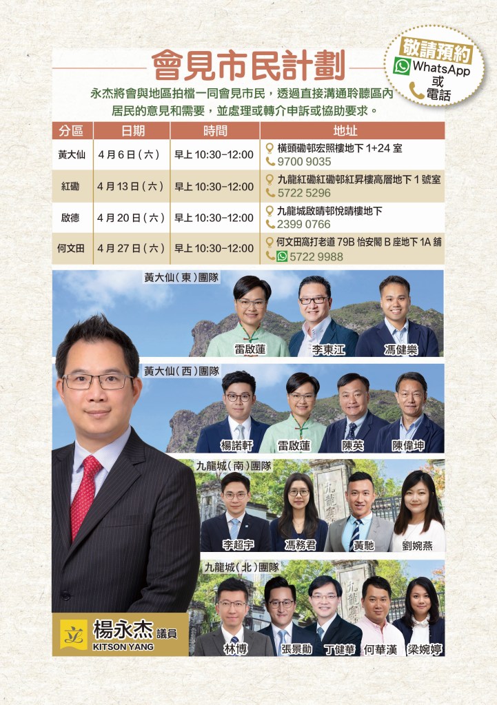 今個星期六楊永杰議員將會來到紅磡會見有需要嘅市民,有需要預約嘅朋友請whatsapp 57225296預約啦!